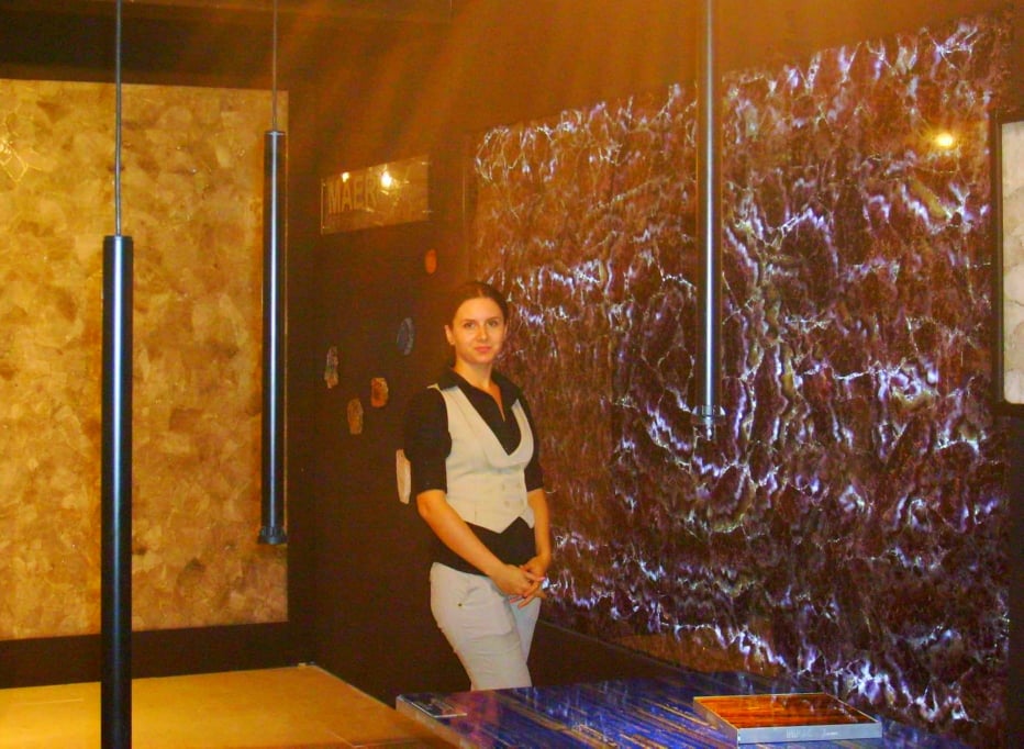 A fost dragoste la prima vedere. Nici nu a fost prea greu, ce-i drept. În fața mea stătea impunătoare o lastră imensă de 180×100 cm, compusă din zeci de bucăți de ametist, tăiate, lustruite și lipite împreună cu o rășină specială, după cum urma să aflu imediat ce ieșeam din transă (Ce bine ar arăta la mine în baie! Ce bine ar fi să am o casă mai mare!). După ce gândurile de renovare mi-au dat pace (pietrele astea costă ceva!) și mi-am făcut o idee despre procesul de producție atât de meticulos – pentru o lucrare mai complexă, putea să dureze câteva săptămâni- am înțeles și de ce fusesem atât de vrăjită. Fiind o piatră semiprețioasă semi transparentă, în spatele plăcii fusese amplasat un sistem de iluminat din leduri. De acolo și jocul seducător de nuanțe! Pentru a fi pregătită apoi în fața vizitatorilor și posibililor clienți, am aflat apoi și specificațiile mai tehnice: ametistul este o varietate de cuarț, ce se regăsește în locații precum Brazilia, Sri Lanka, Uruguay, Tanzania, de cele mai multe ori sub formă de geodă, are duritate 7 (din 10) pe scara Mohs, nuanța de violet fiind dată de cantitățile mici de cupru sau mangan.